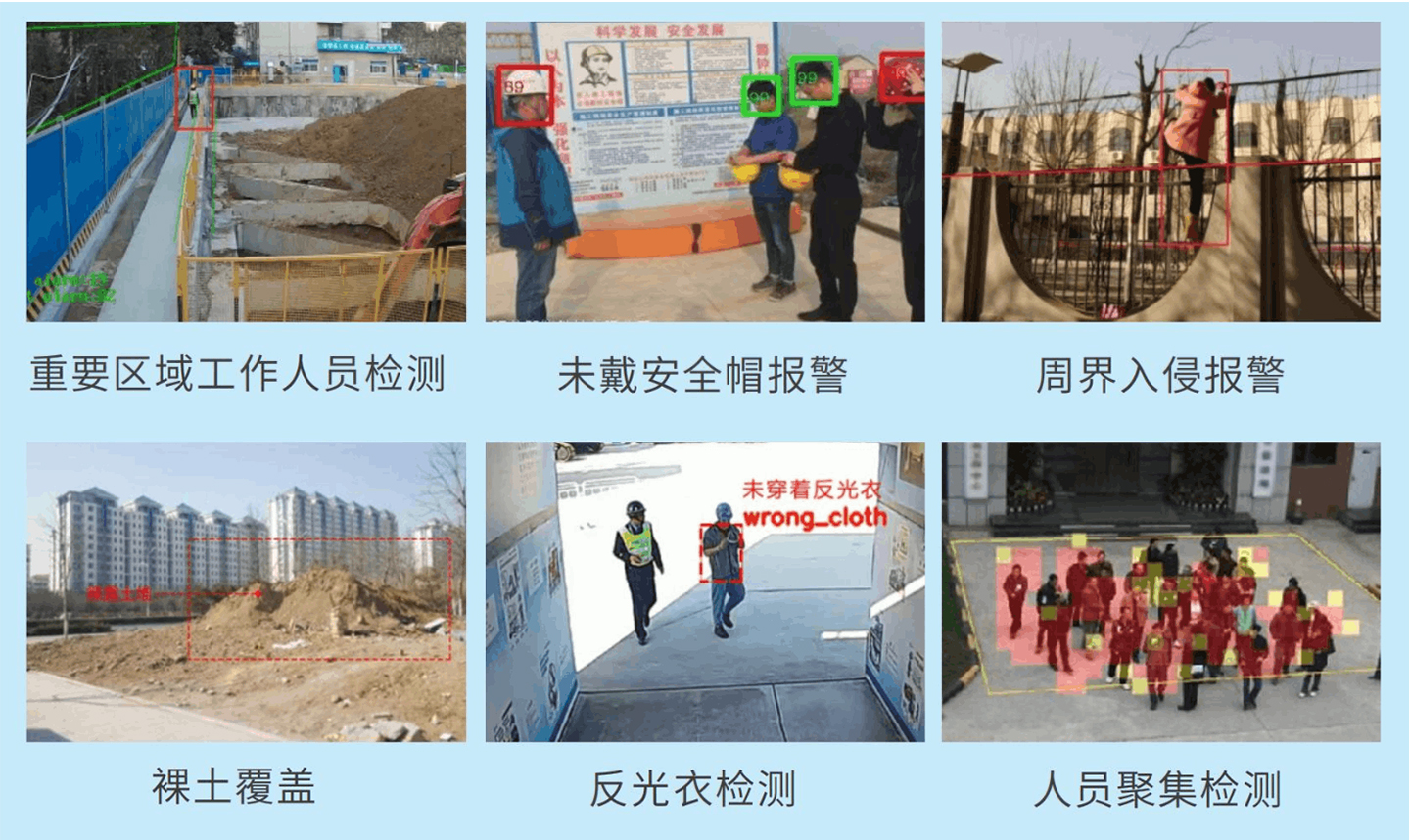 工人安全帽检测、反光衣检测、越界检测、人数统计、重点区域入侵报警、火焰识别等功能,并可结合施工场景进行相关算法定制化开发。